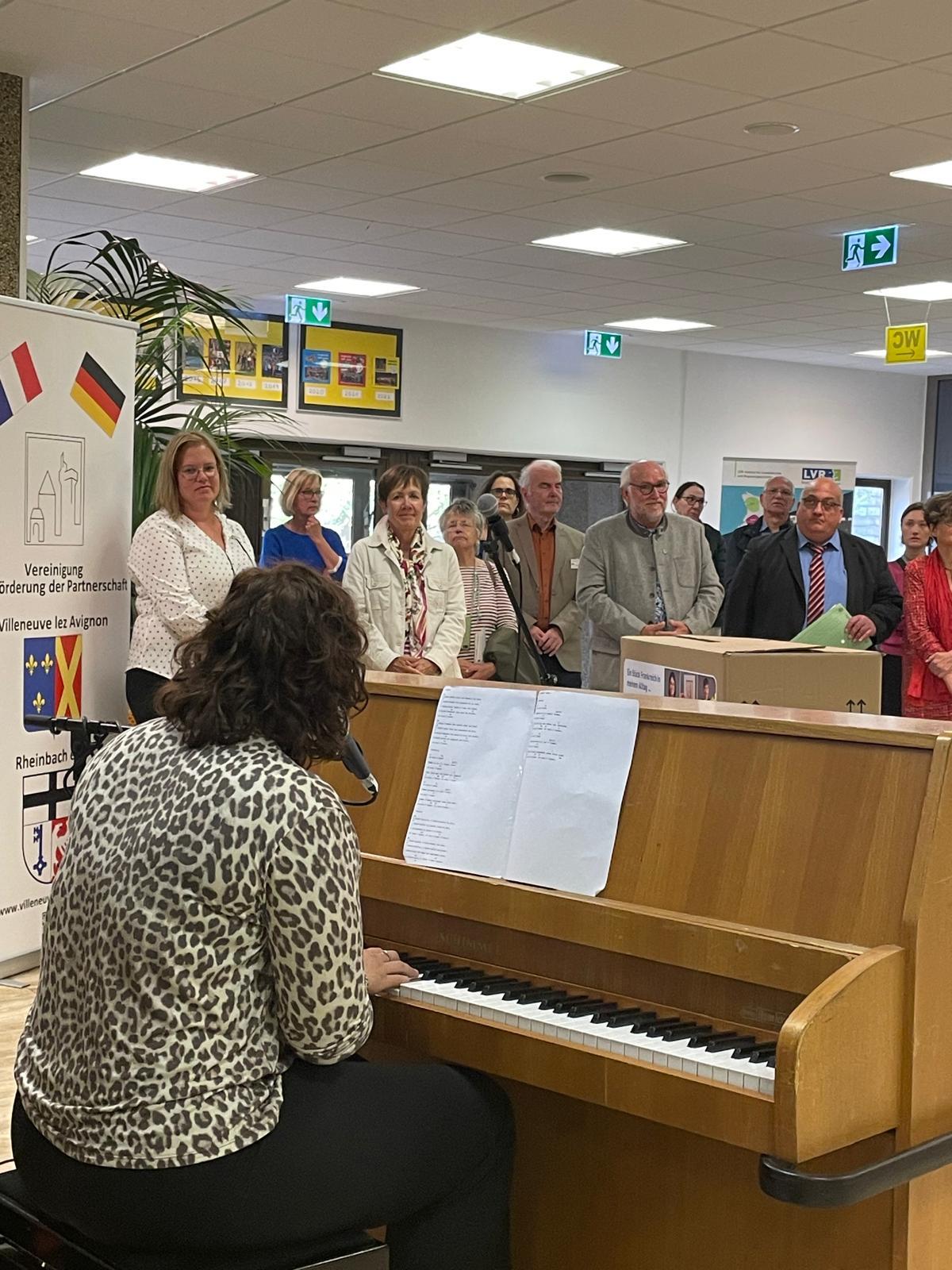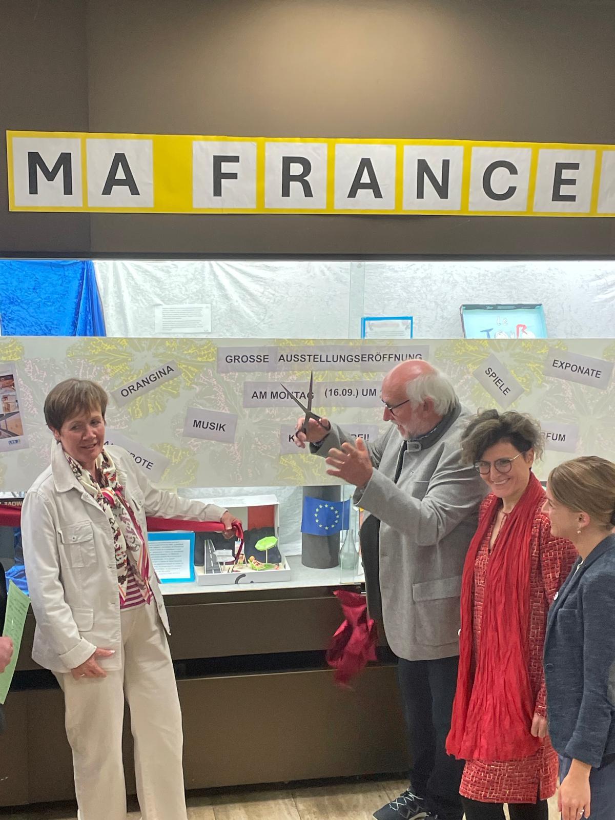 Am 16.09.2024 eröffnete um 16 Uhr eine große Frankreichausstellung im Foyer des Städtischen Gymnasiums. Viele Jugendliche der Schule haben sich daran beteiligt. Mehrere 10. Klassen bastelten ihre Vorstellung von Frankreich im Schuhkarton nach, eine 7. Klasse beschäftigte sich sogar im fächerverbindenden Unterricht gleich auf mehreren Ebenen mit dem Thema Frankreich: Im Deutschunterricht gestalteten sie Werbeplakate und Produktverpackungen eines Französischen Parfums, das Sie im Chemieunterricht schließlich selbst herstellten und in Flakons abfüllten. Eine 9. Klasse kreierte eine digitale Karte mit Spuren Frankreichs/der französischen Sprache in dem Heimatort Rheinbach. Der Oberstufenkurs der Q1 verfasste und vertonte eigene Statements zu der Frage, wieviel Frankreich in ihrem Alltag zu finden ist und woher die Liebe zu Land und Sprache kommt. Die Ausstellung erweitert nun eine bestehende Wanderausstellung des LVR Bonn zum Thema. Auch der Partnerschaftsverein Villeneuve-lez-Avignon war am Eröffnungstag mit Repräsentanten und Informationsmaterial zur Stelle, als der stellvertretende Bürgermeister Rheinbachs, Kerstholt, die Ausstellung eröffnete. Pia Klotz der Q2 begleitete die Soirée musikalisch mit Chansons am Klavier, außerdem gab es Crêpes, Orangina und Sekt für die zahlreichen BesucherInnen.